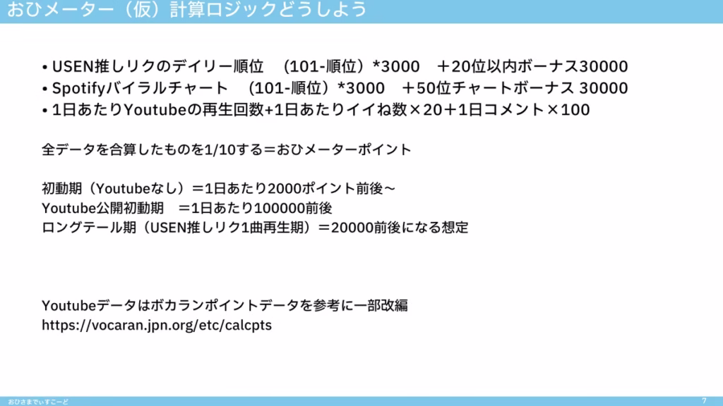 音源公開~1か月程度(累積100万おひメーター相当)になるまでデータを取得し、ファン側の「がんばった」を可視化します。